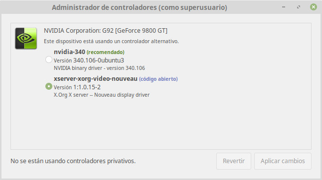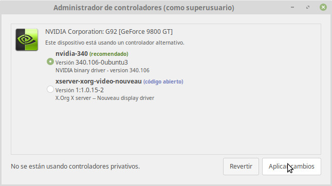 En cualquiera de los casos, para probar si el redimiento del equipo mejora con el controlador ofrecido, lo seleccionamos y pinchamos en Aplicar cambios: