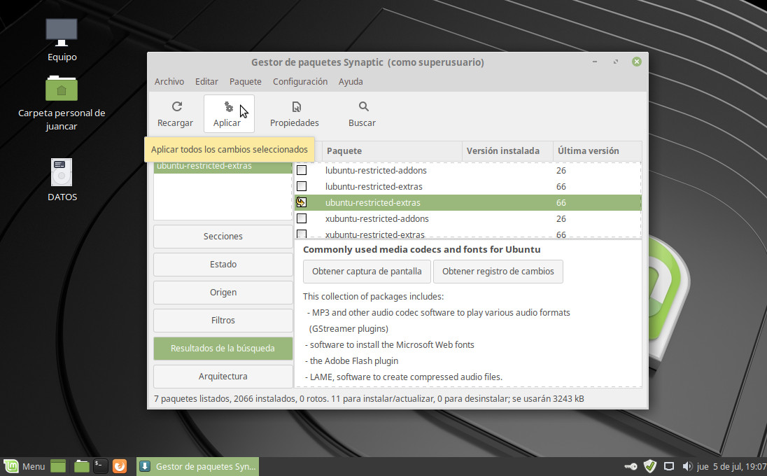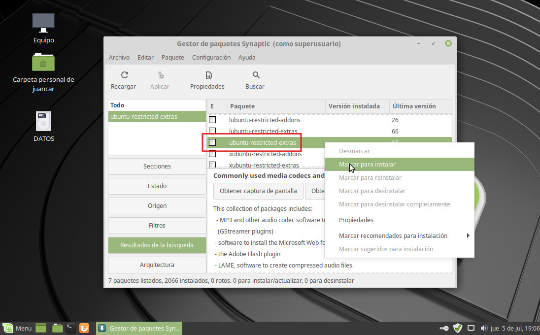 Pinchamos en Buscar y el cuadro de búsqueda escribimos ubuntu-restricted-extras > Buscar: