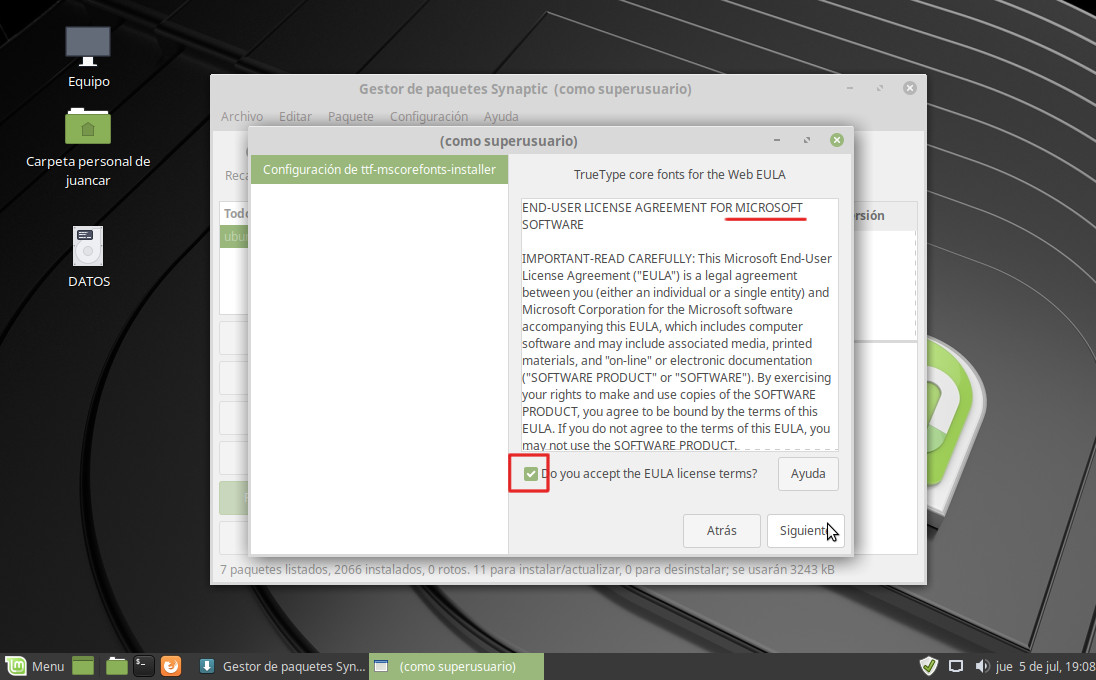 Debemos aceptar la licencia de Microsoft para utilizar sus fuentes. Siguiente: