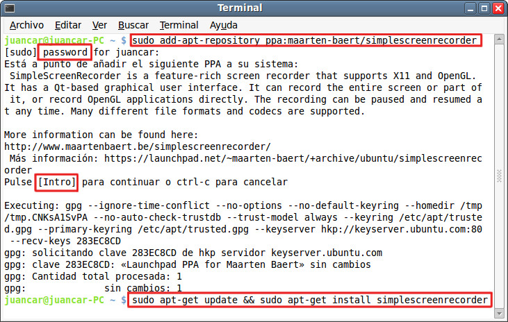 sudo add-apt-repository ppa:maarten-baert/simplescreenrecorder y pulsamos [ENTER]