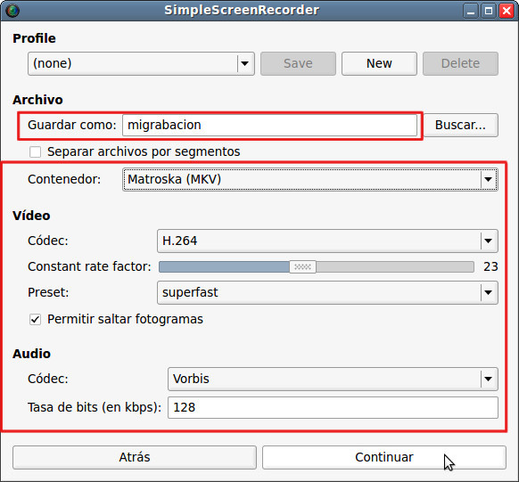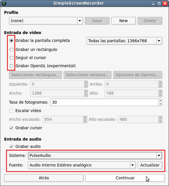 4.- Primera pantalla de configuración. Elegimos lo que queramos aunque las opciones por defecto suelen bastar. Hay que ver en el apartado Audio, si hay más de una fuente, cual es la buena. Continuar: